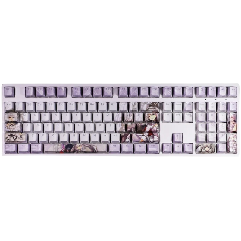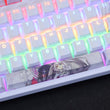 This mechanical keycaps set features various prints of Kurumi Tokisaki from the anime "Date A Live" that are bound together with white and light purple colouring, combined with Backlit keycaps, Kurumi Tokisaki illuminates when LEDs pass through the keycaps.