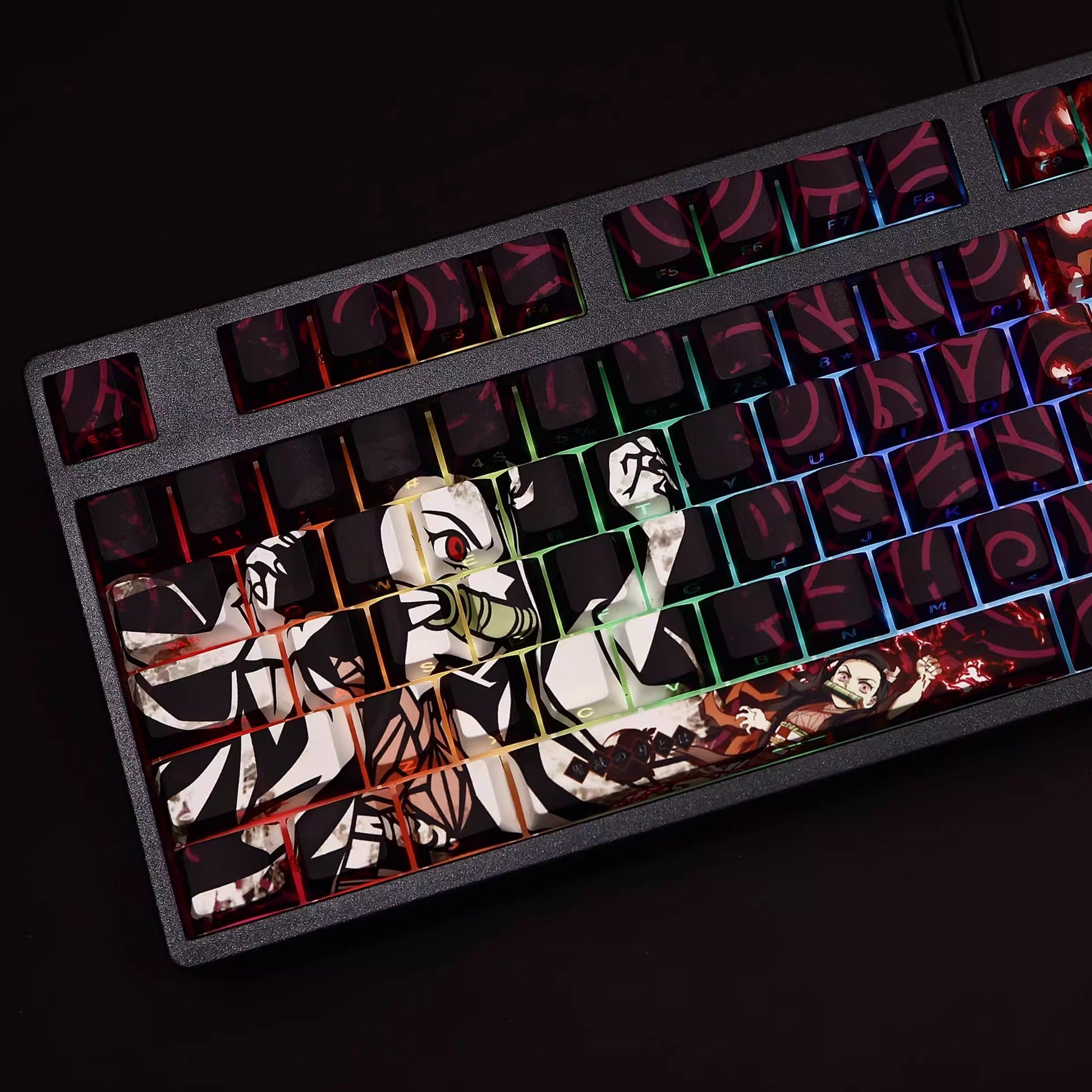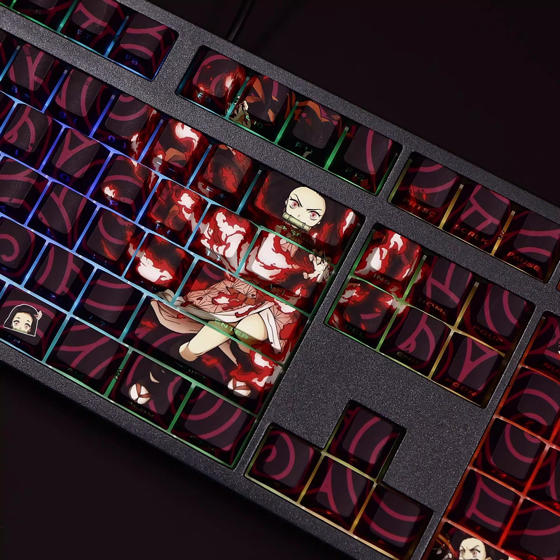 This mechanical keycaps set features various prints of Nezuko Kamado from the anime "Demon Slayer" that are bound together with red, black and purple colouring, combined with Backlit keycaps, Nezuko Kamado illuminates when LEDs pass through the keycaps.