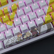 This mechanical keycaps set features various prints of characters from the anime "Do It Yourself!!" bound together with white, yellow and pink colouring, combined with Backlit keycaps, the characters illuminate when LEDs pass through the keycaps.