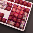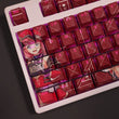 This mechanical keycaps set features various prints of Charlotte from the Game "Genshin Impact" that are bound together with red colouring, combined with Backlit keycaps, Charlotte illuminates when LEDs pass through the keycaps.