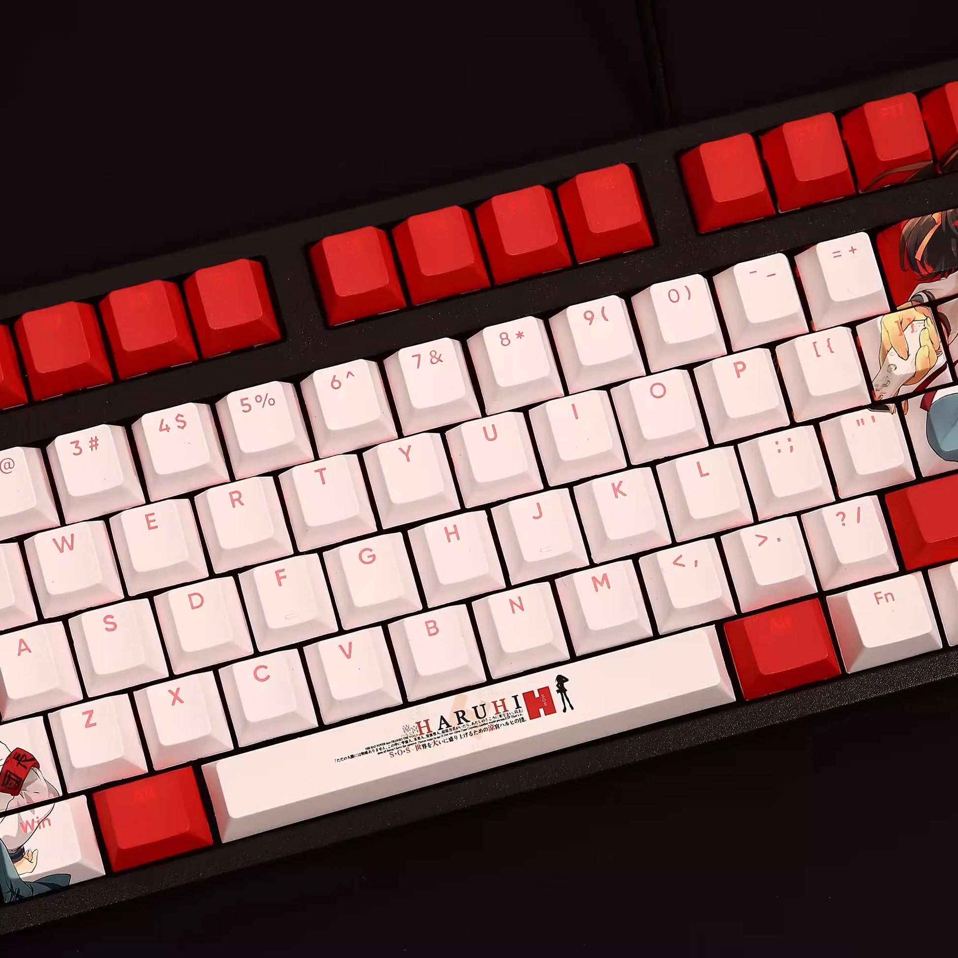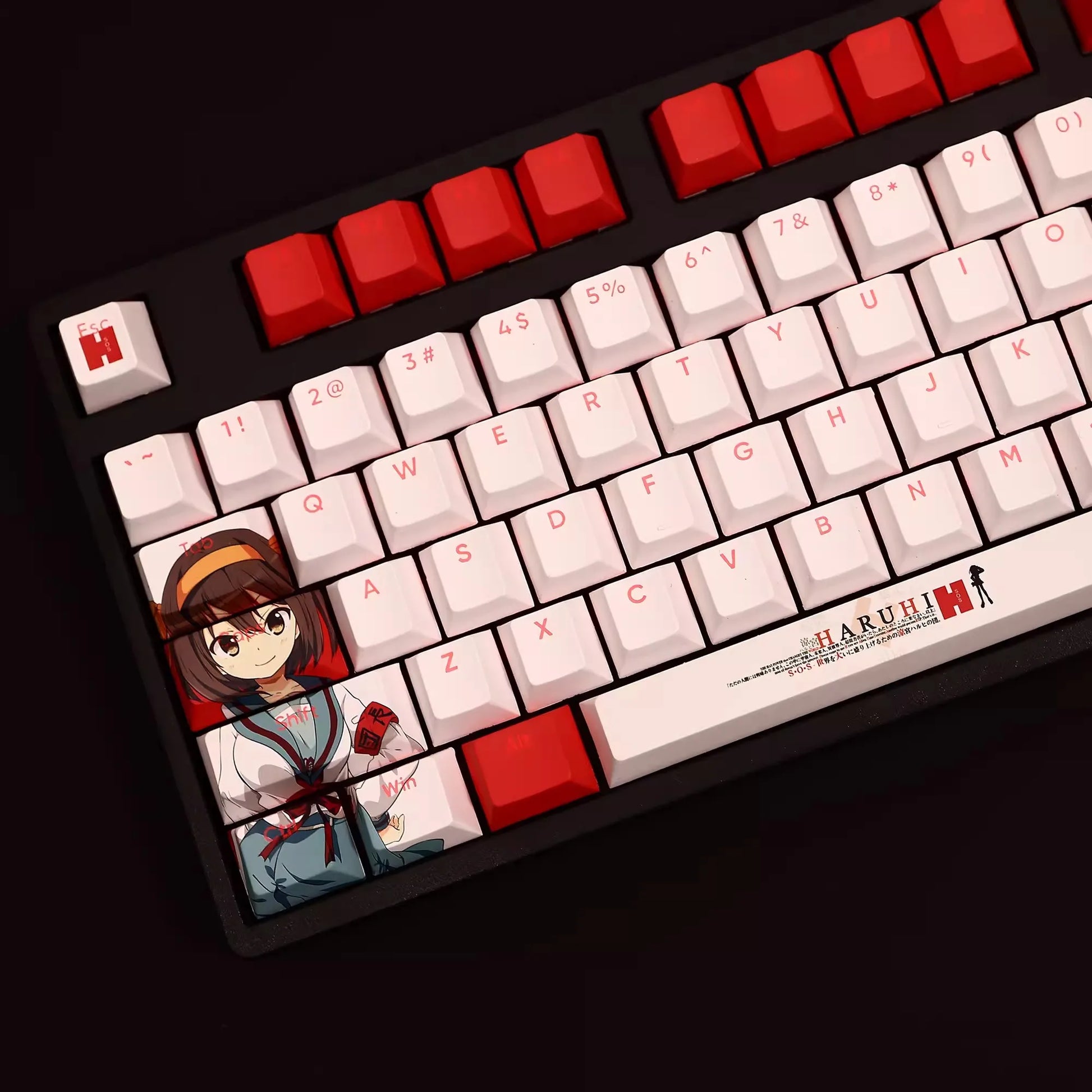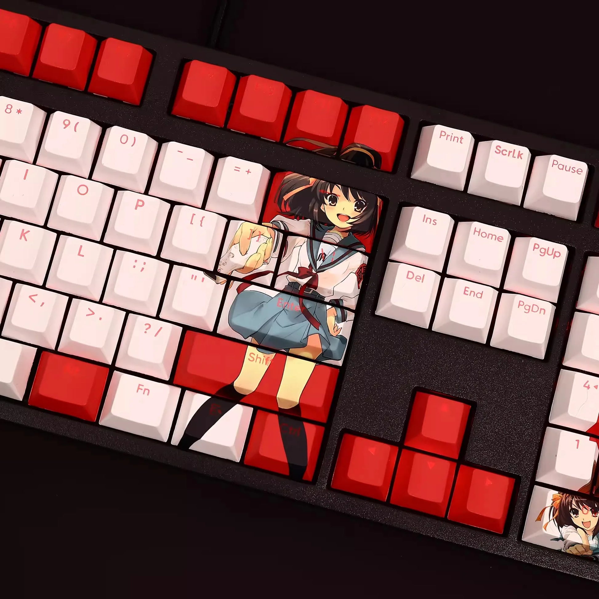 This mechanical keycaps set features various prints of Haruhi Suzumiya from the anime "Haruhi Suzumiya" that are bound together with white and red colouring, combined with Backlit keycaps, Haruhi Suzumiya illuminates when LEDs pass through the keycaps.
