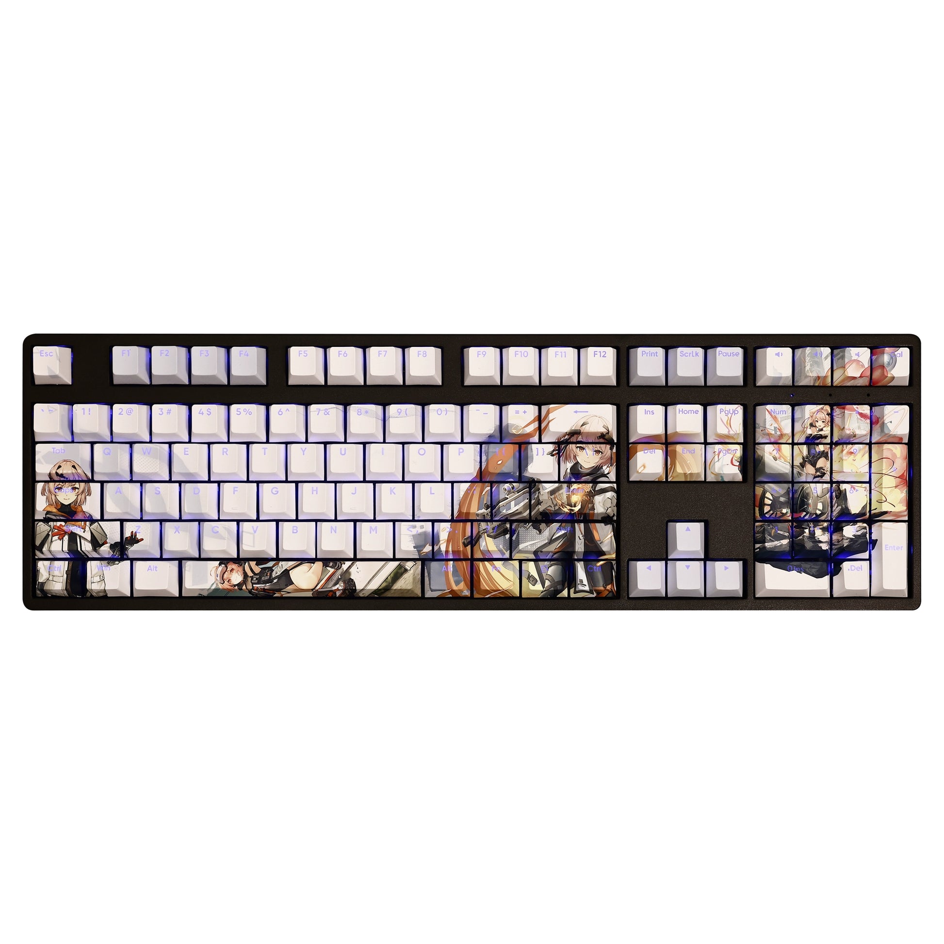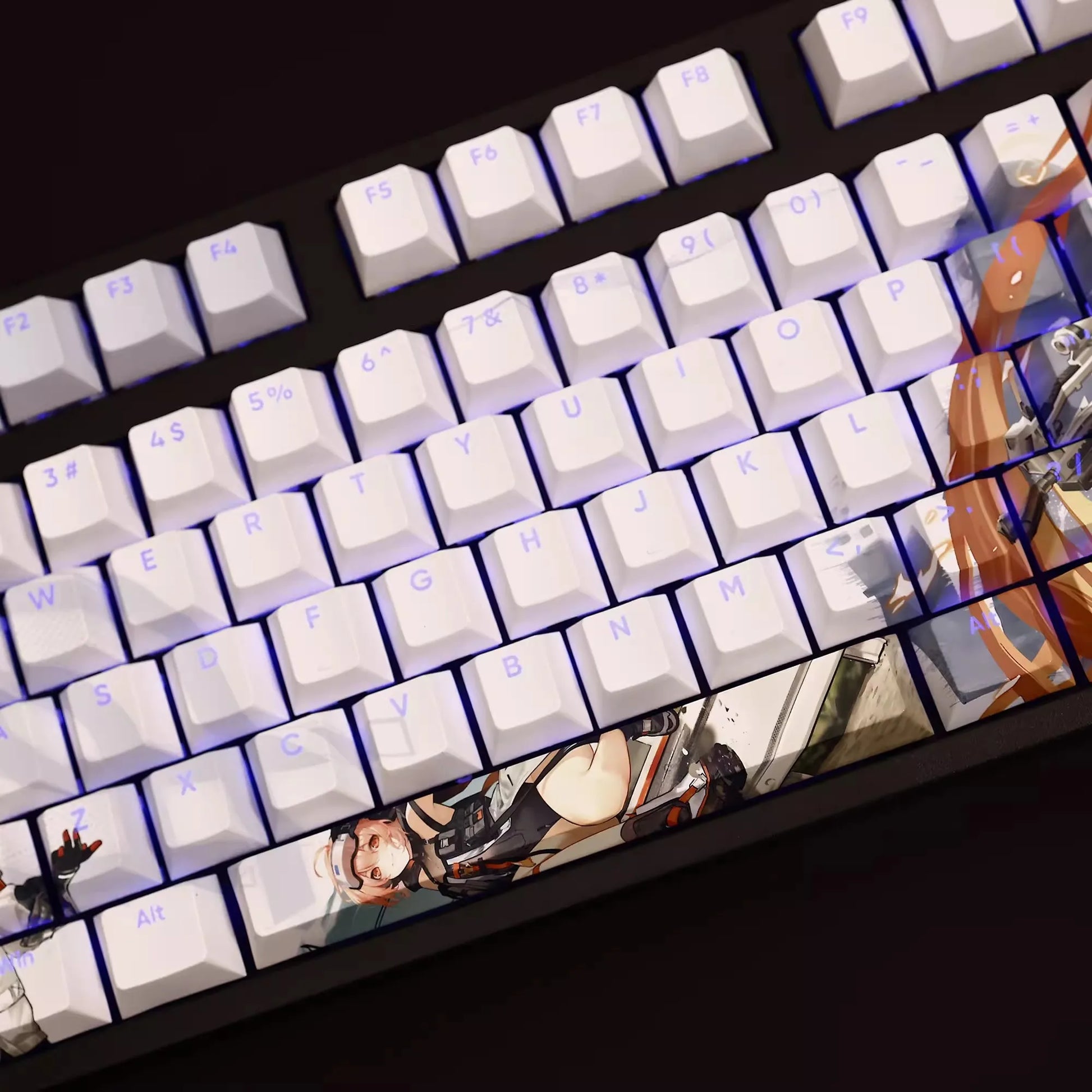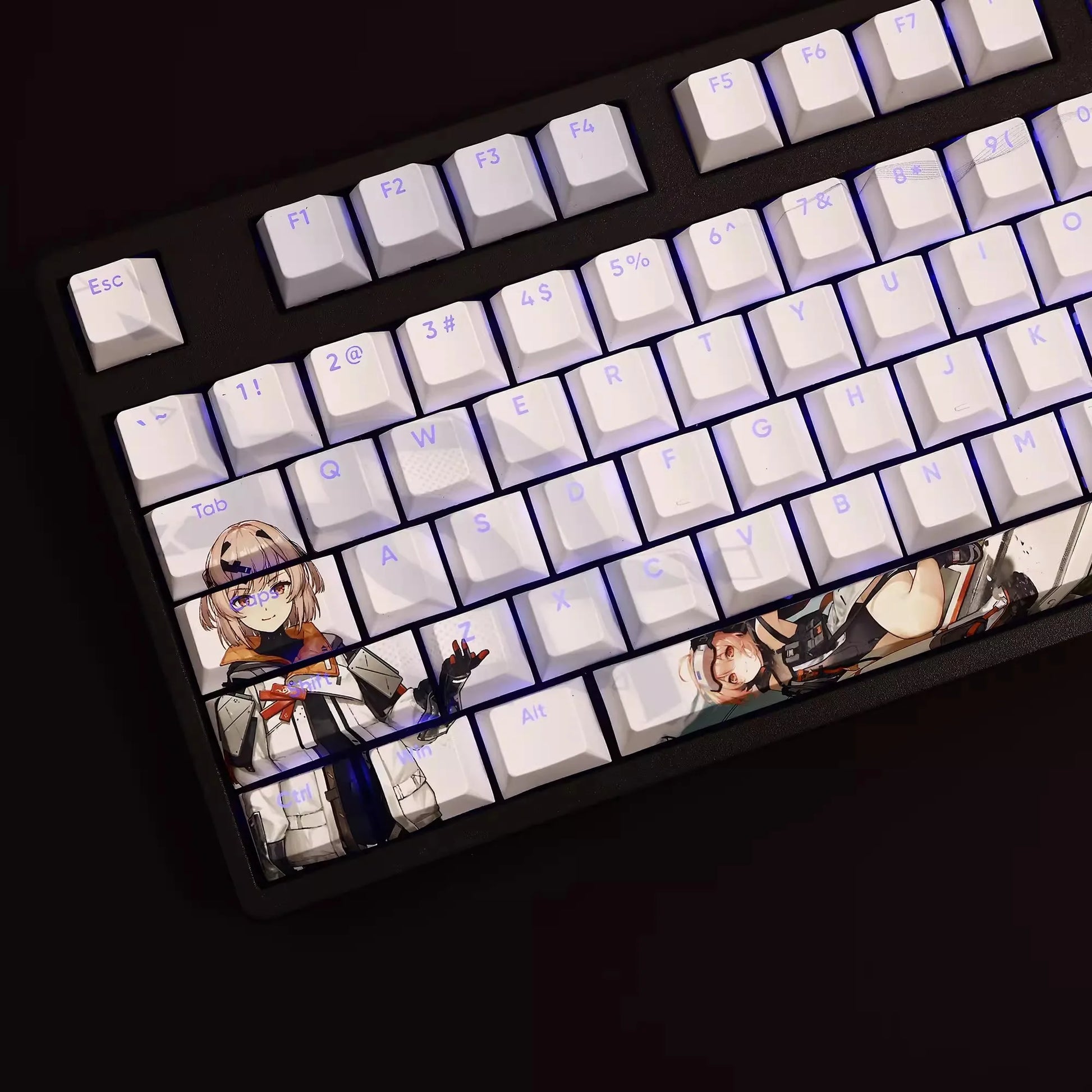 This mechanical keycaps set features various prints of Fritia Ignis from the game "Snowbreak: Containment Zone" that are bound together with white colouring, combined with Backlit keycaps, Fritia Ignis illuminates when LEDs pass through the keycaps.