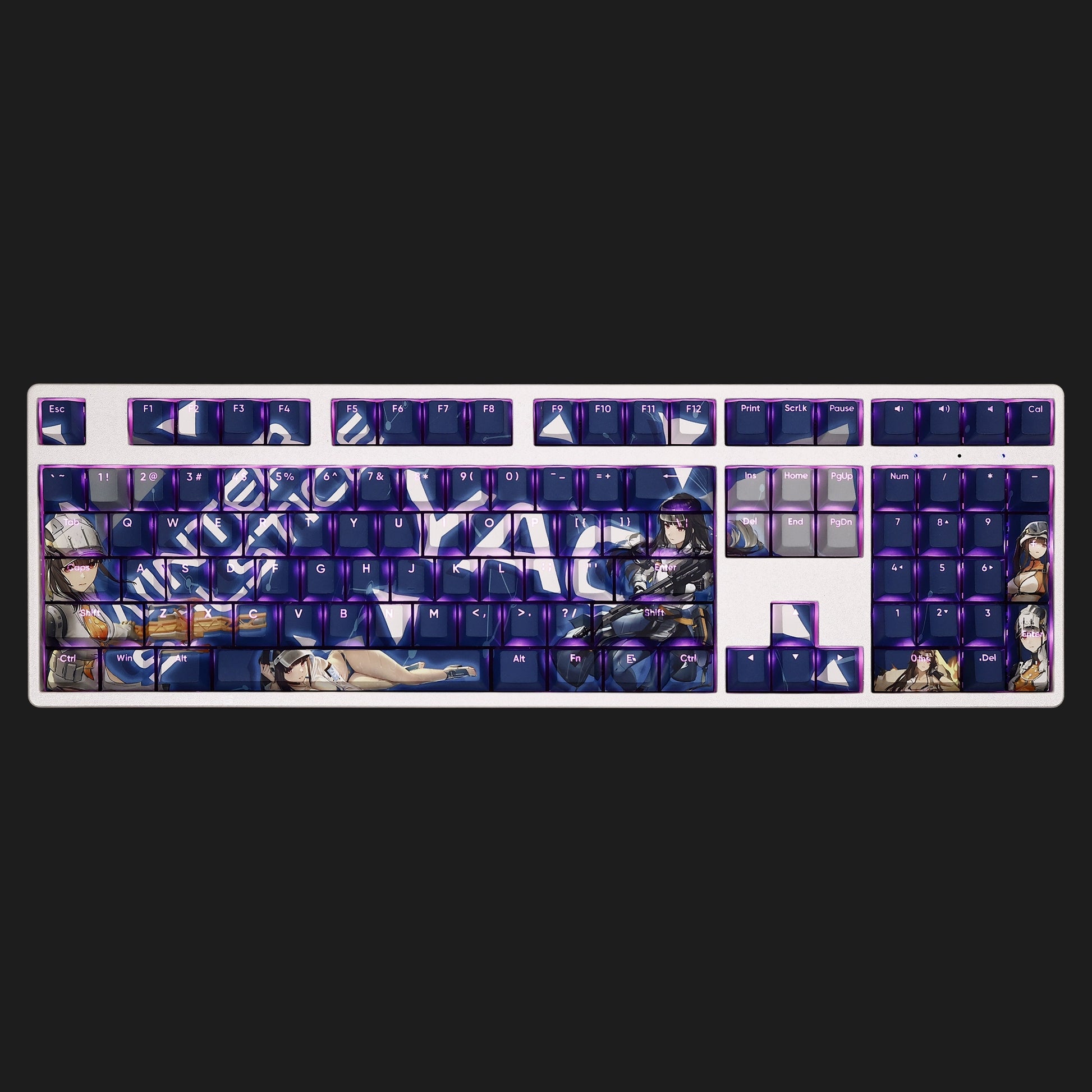 This mechanical keycaps set features various prints of Yao from the game "Snowbreak: Containment Zone" that are bound together with blue colouring, combined with Backlit keycaps, Yao illuminates when LEDs pass through the keycaps.